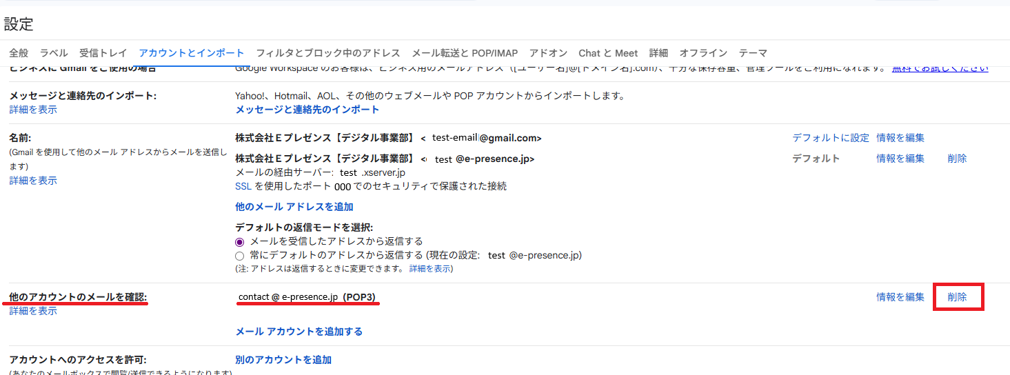 [設定](歯車マーク)→[すべての設定を表示]→[アカウントとインポート]→[他のアカウントのメールを確認]にPOP設定があるか確認