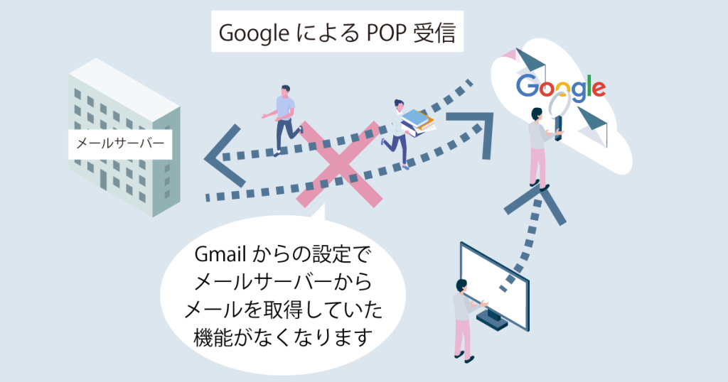 これまでGmail上で他社メールを受信していた場合は、IMAP方式への移行またはメール転送設定への切り替えが必要です。