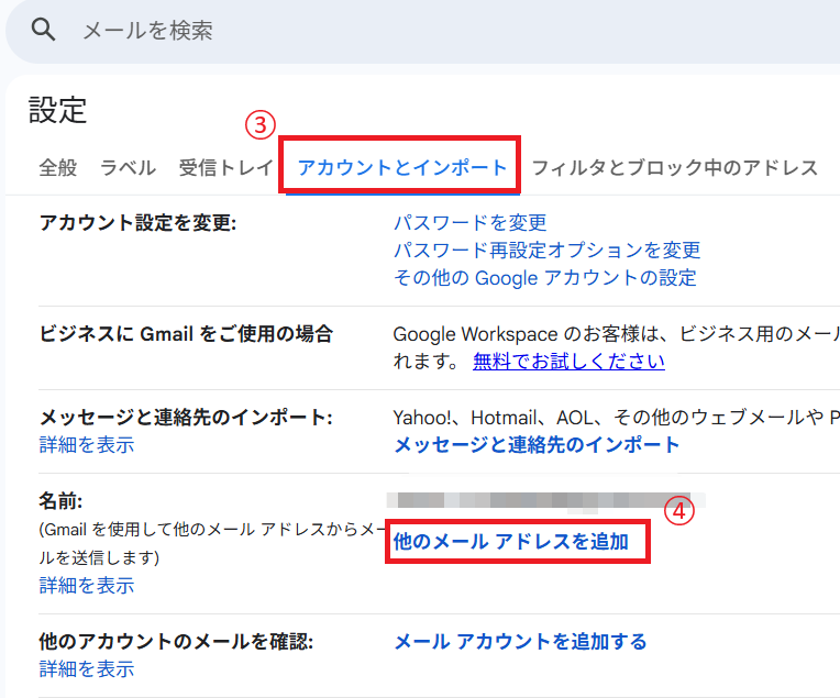 1. Gmail設定 > アカウントとインポート > 名前:他のメールアドレスを追加